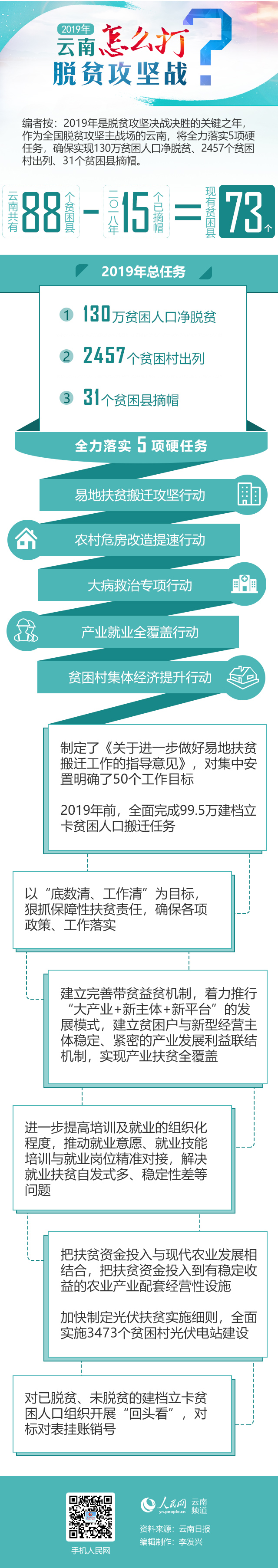 2019年是脫貧攻堅決戰(zhàn)決勝的關鍵之年,作為全國脫貧攻堅主戰(zhàn)場的云南,將全力落實易地扶貧搬遷攻堅行動、農(nóng)村危房改造提速行動、大病救治專項行動、產(chǎn)業(yè)就業(yè)全覆蓋行動、貧困村集體經(jīng)濟提升行動5項硬任務,確保實現(xiàn)130萬貧困人口凈脫貧、2457個貧困村出列、31個貧困縣摘帽。