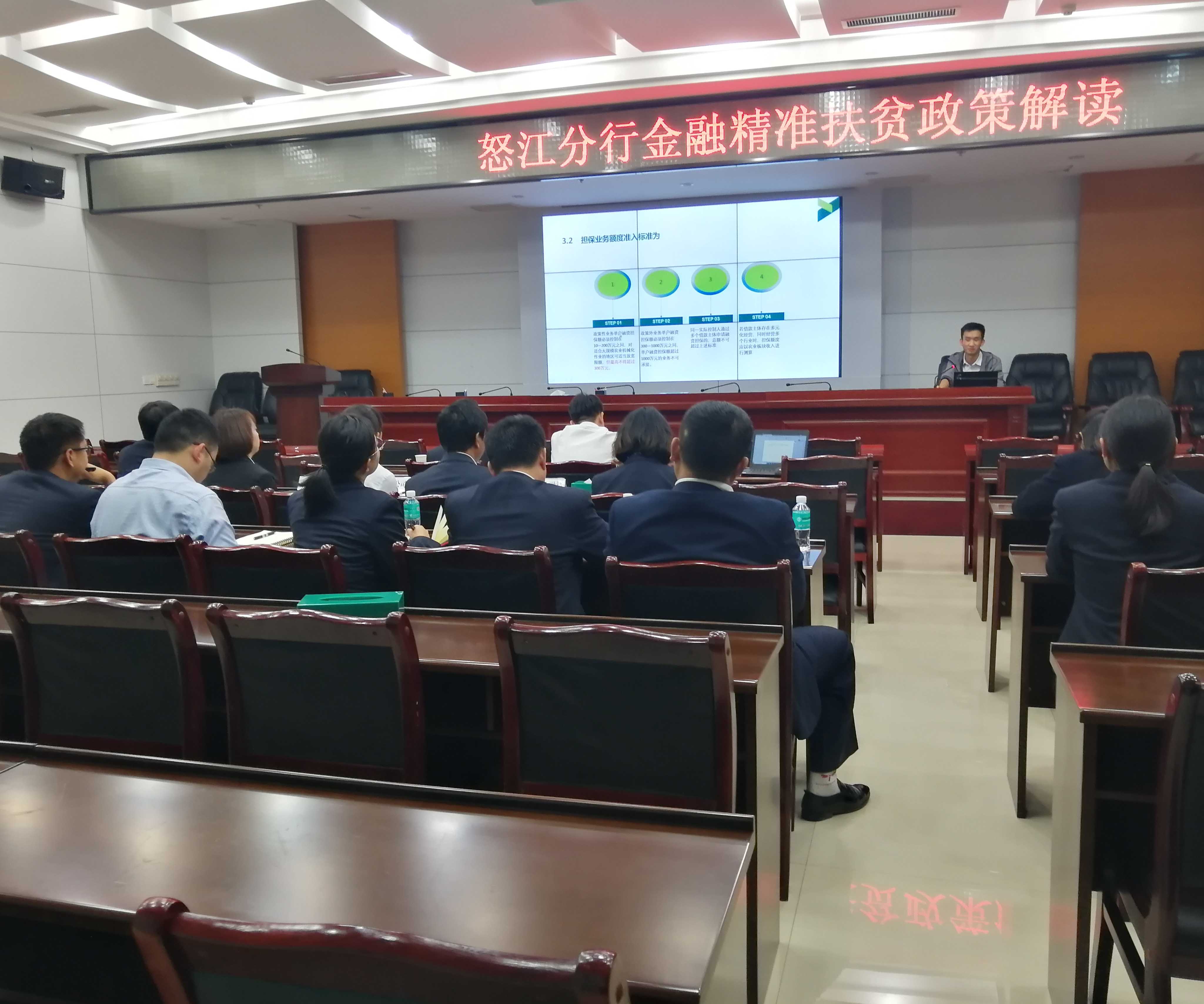 2019年3月27日,瀘水辦事處全體人員參加了農(nóng)業(yè)銀行瀘水市支行的“銀擔(dān)保座談會”,并現(xiàn)場開展了業(yè)務(wù)培訓(xùn)。農(nóng)業(yè)銀行怒江州副行長李磊、怒江州副行長段玉珊,瀘水市副行長李婧,和各縣市分行客戶經(jīng)理出席了會議。
