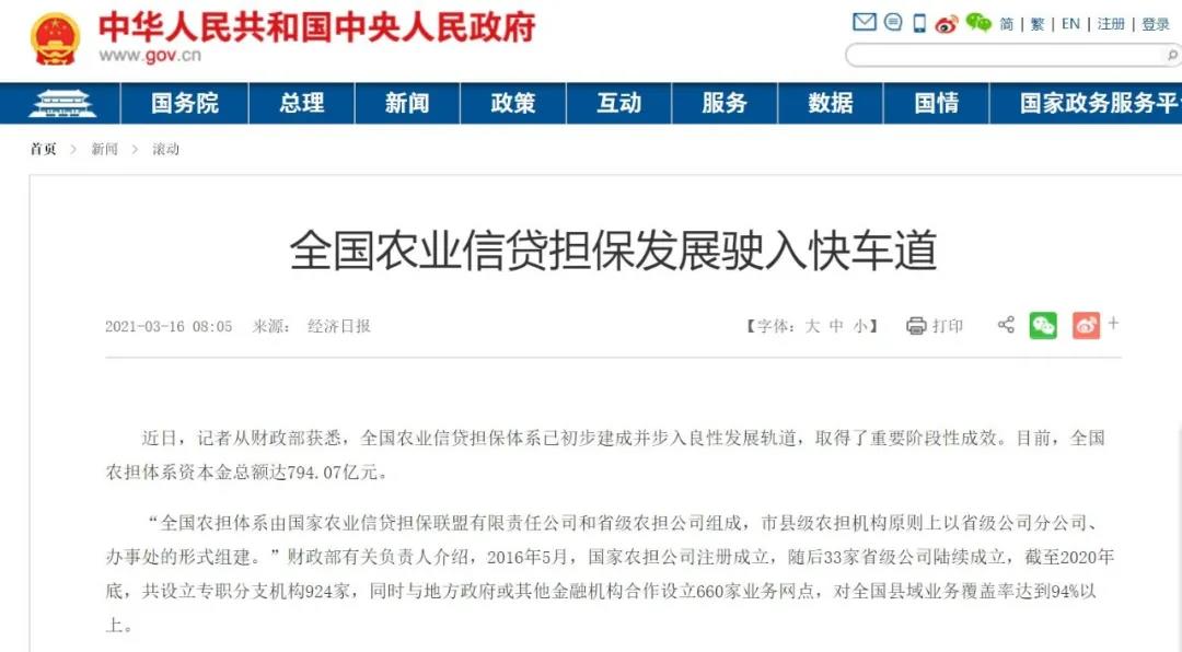 “全國(guó)農(nóng)擔(dān)體系由國(guó)家農(nóng)業(yè)信貸擔(dān)保聯(lián)盟有限責(zé)任公司和省級(jí)農(nóng)擔(dān)公司組成,市縣級(jí)農(nóng)擔(dān)機(jī)構(gòu)原則上以省級(jí)公司分公司、辦事處的形式組建?!必?cái)政部有關(guān)負(fù)責(zé)人介紹,2016年5月,國(guó)家農(nóng)擔(dān)公司注冊(cè)成立,隨后33家省級(jí)公司陸續(xù)成立,截至2020年底,共設(shè)立專職分支機(jī)構(gòu)924家,同時(shí)與地方政府或其他金融機(jī)構(gòu)合作設(shè)立660家業(yè)務(wù)網(wǎng)點(diǎn),對(duì)全國(guó)縣域業(yè)務(wù)覆蓋率達(dá)到94%以上。